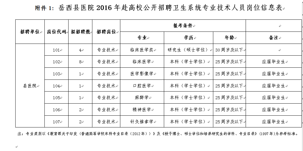 詳見附件1《岳西縣醫(yī)院2016年赴高校招聘衛(wèi)生系統(tǒng)專業(yè)技術(shù)人員崗位信息表》。