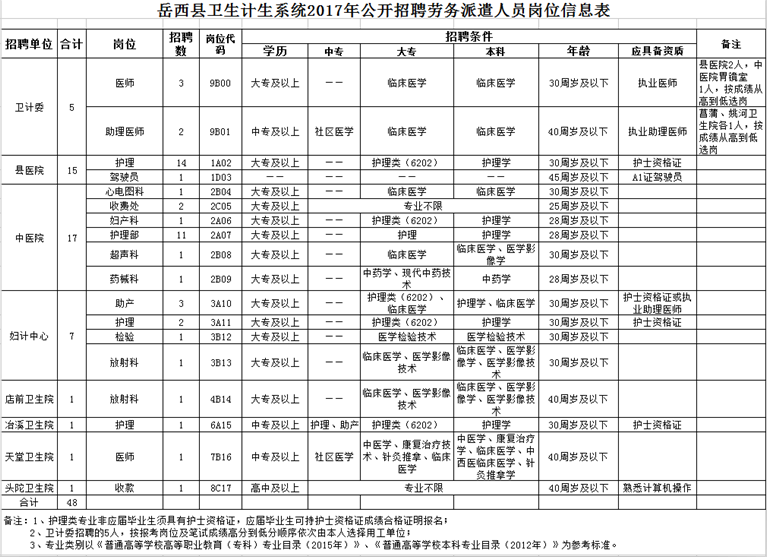 本次招錄崗位為衛(wèi)生計生系統(tǒng)工作人員,主要從事臨床醫(yī)學(xué)、護(hù)理、收款、駕駛等相關(guān)工作,分為18個職位,共計48名。具體見附件1《岳西縣衛(wèi)生計生系統(tǒng)2017年公開招聘勞務(wù)派遣人員崗位信息表》。
