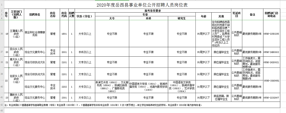招聘單位主管部門電話見附件1《2020年度岳西縣事業(yè)單位公開招聘人員崗位表》。